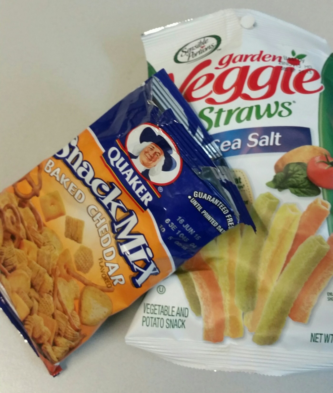 I first chose a small bag of Quaker Baked Cheddar Snack Mix. As soon as I turned the bag over I realized that I had made a bad choice. For such a small bag, it still had 230 calories and 8 grams of fat. Sometimes that’s the amount of calories I eat total during lunch! It all depends on the day and what kind of activity I will be doing. Tonight I’m not sure what kind of exercise I will be getting because I have an appointment after work, and it will depend on the time it ends. With that being said, I wanted a lower calorie lunch today. I pulled out another dollar from my pocket and went for the Garden Veggie Straws with Sea Salt. After all, it boasts of 30% less fat! For the entire bag, it had 130 calories and 7 grams of fat. If only I had chosen this bag first, then I wouldn’t have two bags in my hand. I was okay with the stats of the Veggie Straws. Of course, I would have liked for it to be 80 calories and 0 fat, but that’s hard to find for chips!